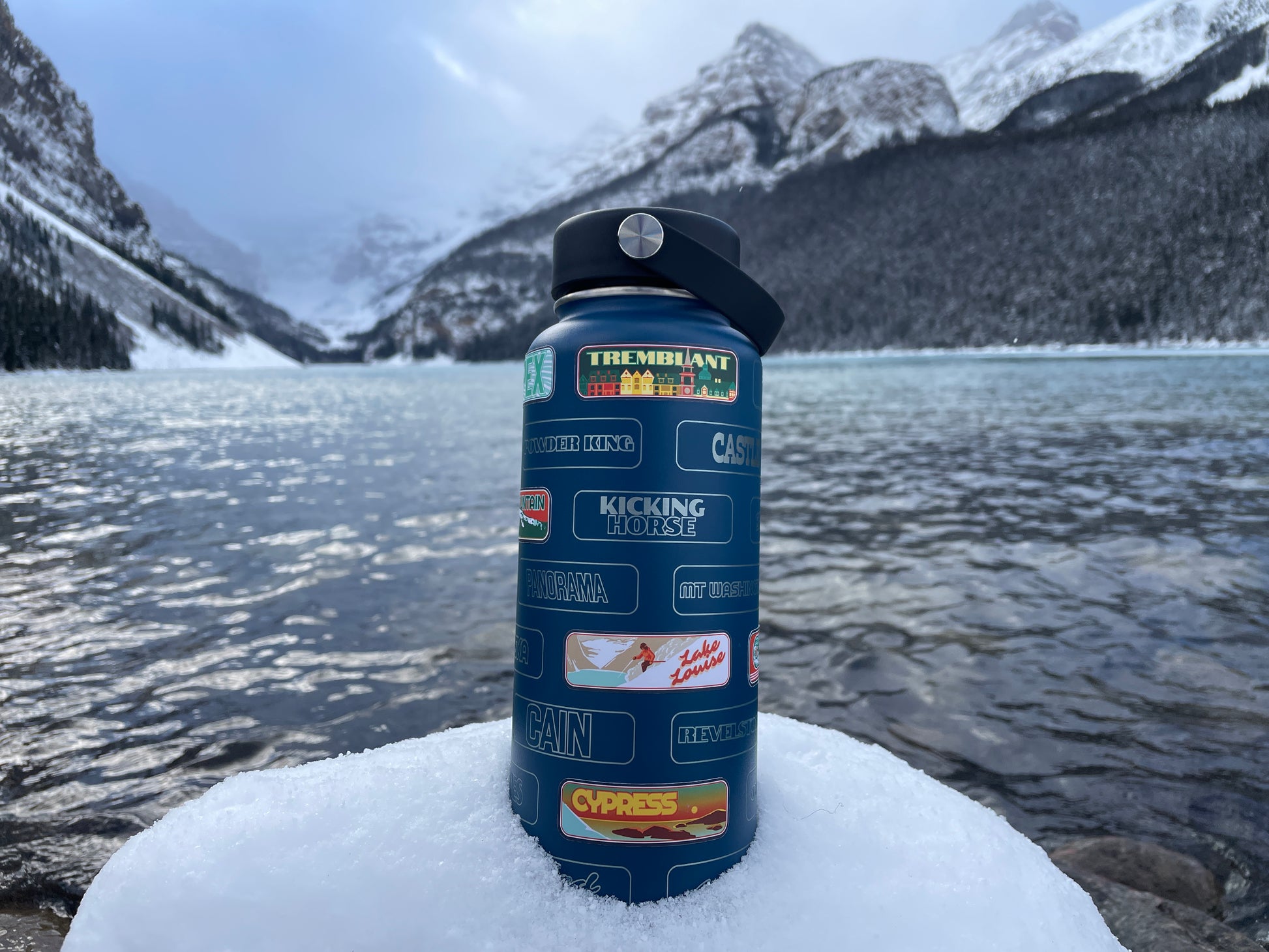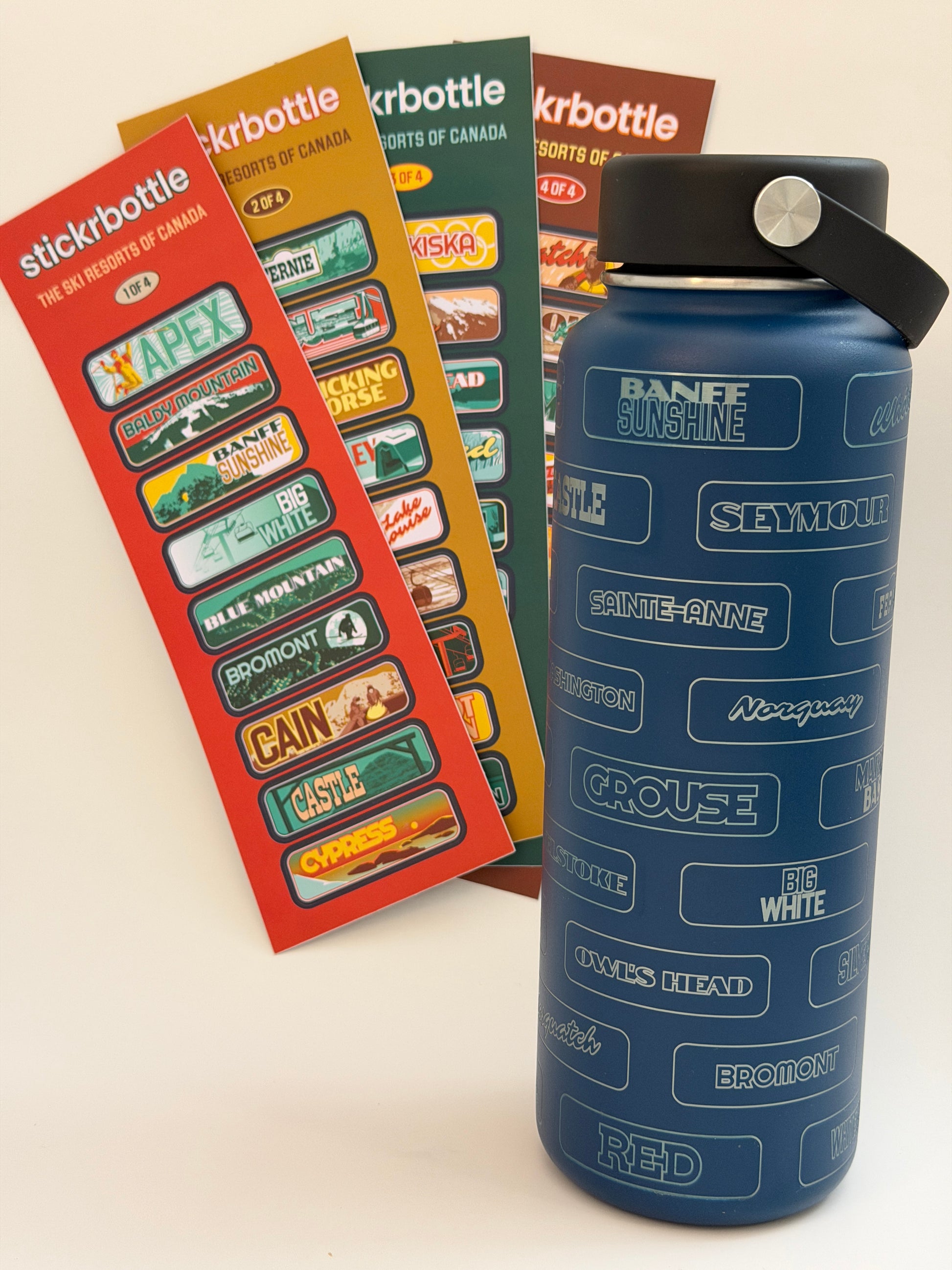 The stickrbottle isn't just for drinking. It's your trophy, your story, your vision board. A place to track the adventures you've lived and the ones still calling your name. The stickrbottle bottle features unique artwork showcasing 36 of the most iconic ski resorts in Canada. Every time you adventure to a new mountain, slap on the matching sticker and track your progress from coast to coast.